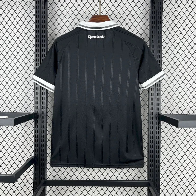 Elegância retrô com atitude urbana: a nova Away do Botafogo traz o preto como base, gola polo branca e punhos contrastantes, além de texturas em jacquard e detalhes prateados que remetem à era dos bailes charme. Parte da coleção ‘Aura 90’, une história e estilo com autenticidade. Edição, disponível agora.