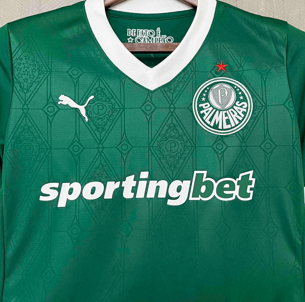 A Camisa Feminina do Palmeiras para a temporada 2025/2026, fabricada pela Puma, celebra as conquistas históricas do clube com um design moderno e elegante. O manto apresenta detalhes que homenageiam as glórias do Verdão, incluindo grafismos que exaltam as taças conquistadas, com destaque para os 12 títulos brasileiros.