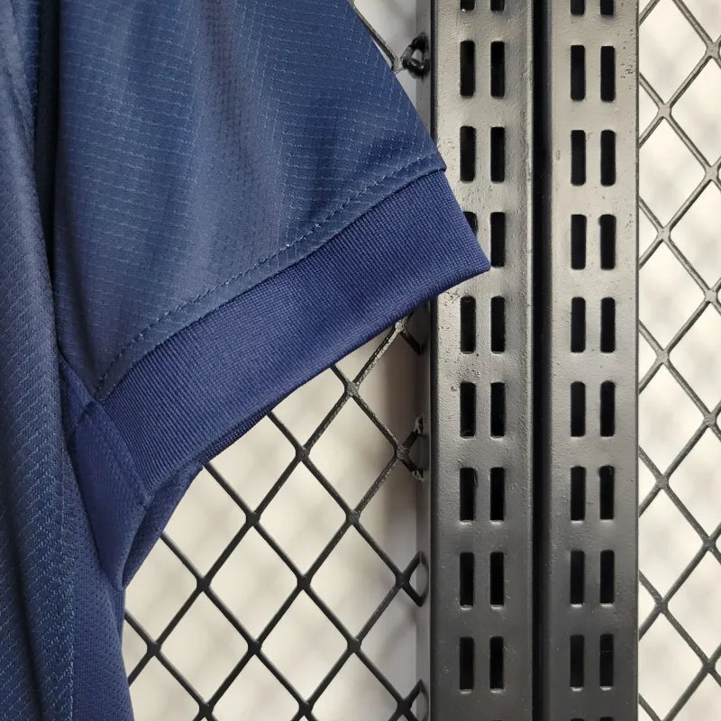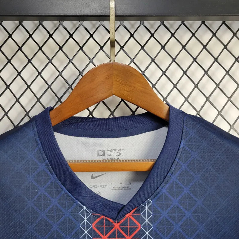A nova camisa titular do Paris Saint-Germain para a temporada 2025/26 apresenta uma base azul-marinho (Midnight Navy) com acentos vibrantes em vermelho e branco, incorporando um gráfico em padrão de treliça inspirado na herança arquitetônica de Paris. O padrão remete especialmente às estrututuras metálicas icônicas da cidade, como a Torre Eiffel, simbolizando a identidade e o legado parisiense