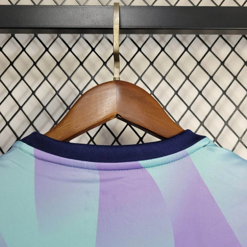 Inspirada nas auroras boreais, esta camisa apresenta um degradê vibrante em tons de lilás e azul aqua, criando um visual único e marcante. O design é complementado por detalhes em azul-marinho nas mangas e gola, conferindo um toque de sofisticação.