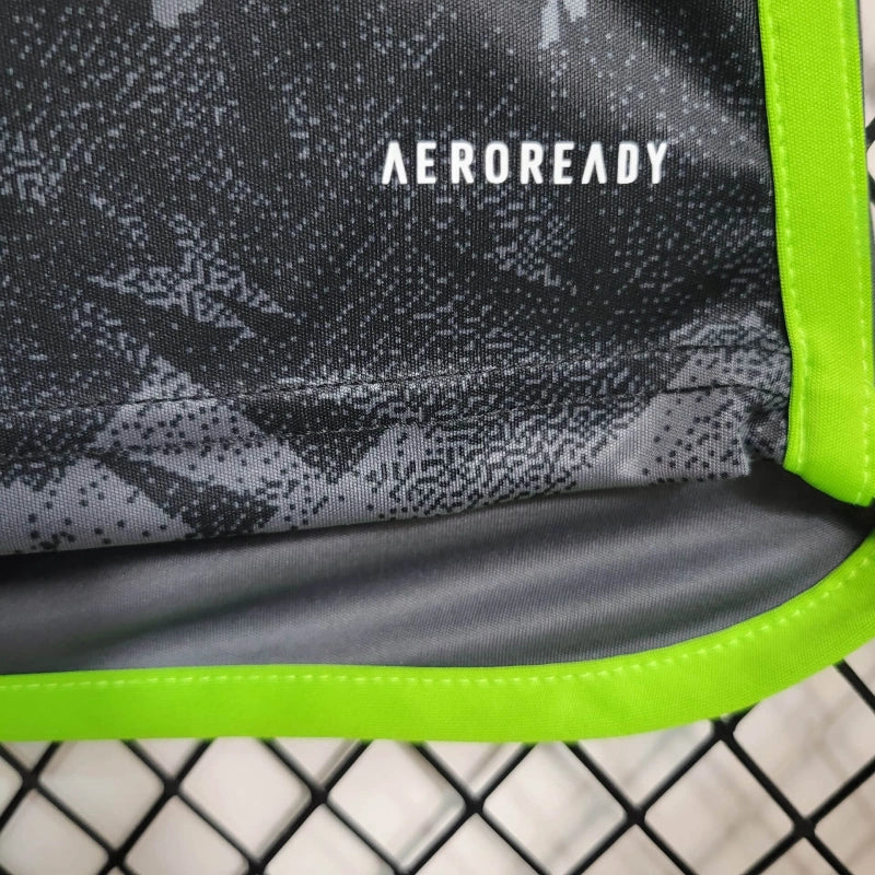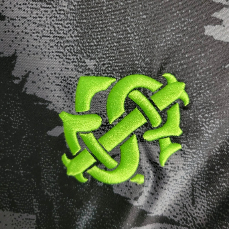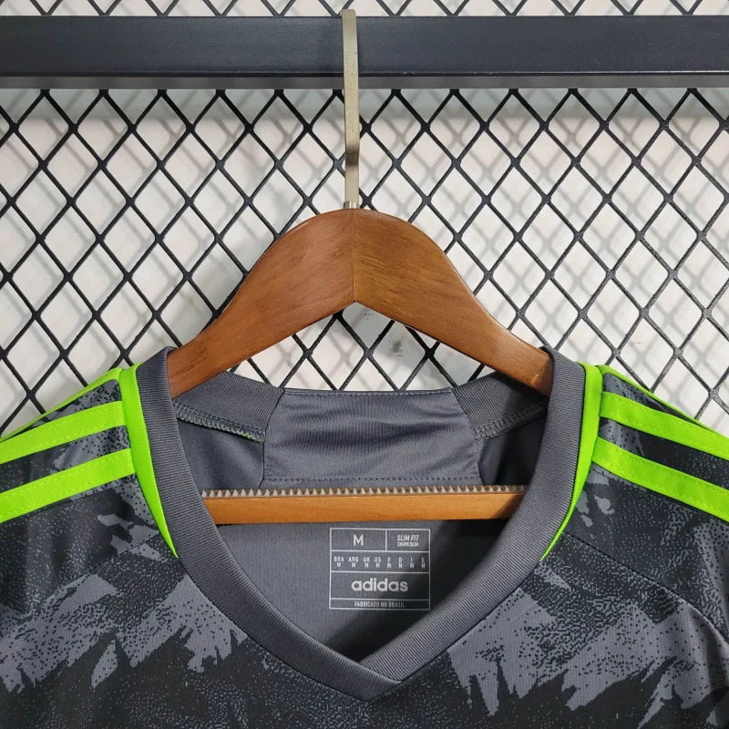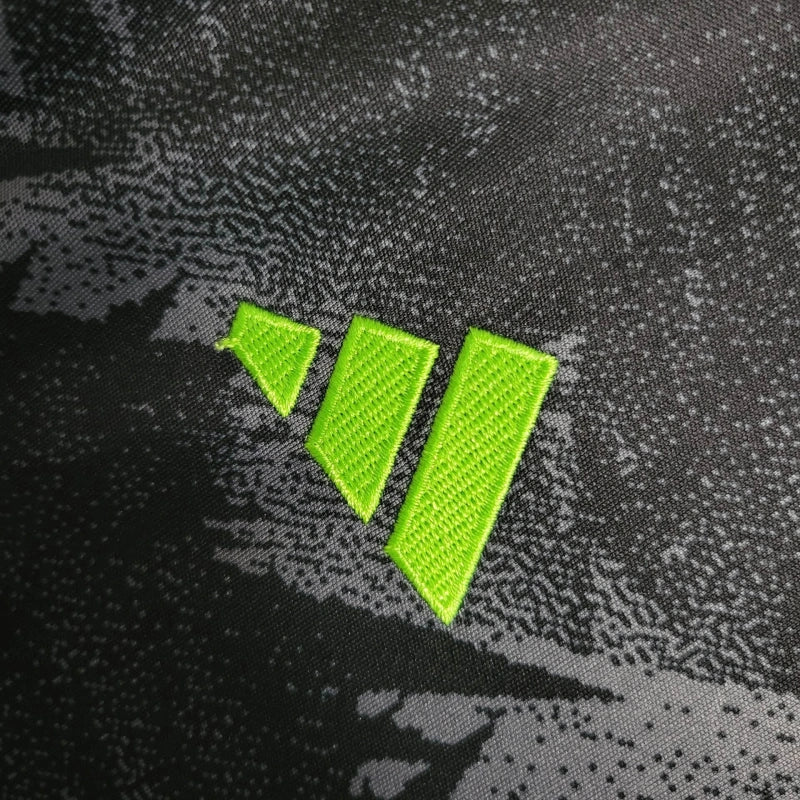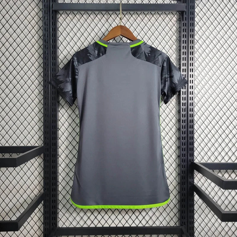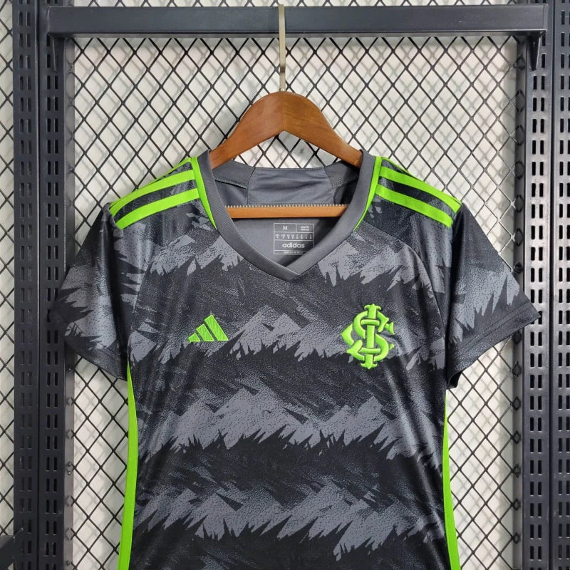A terceira camisa feminina do Sport Club Internacional para a temporada 2023/24, desenvolvida pela Adidas, apresenta um design inovador e sustentável. Predominantemente cinza, o manto exibe um grafismo abstrato em tom sobre tom que forma polígonos, remetendo à textura de um gramado.