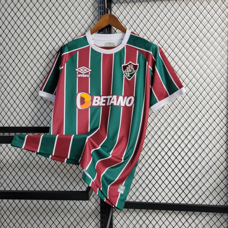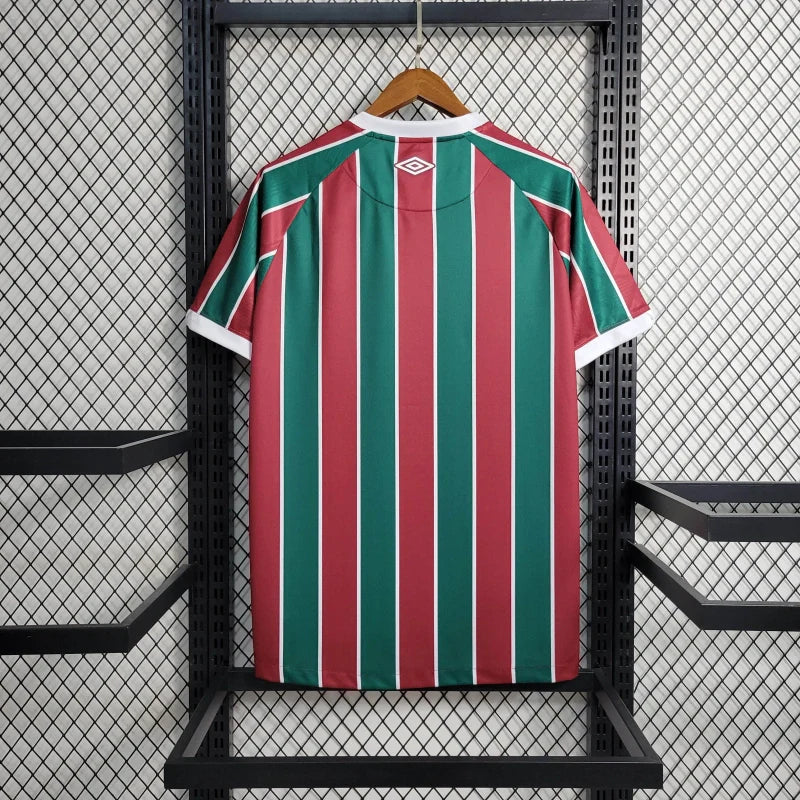 A Camisa Fluminense 1 2023/24 Masculina celebra a rica história do Tricolor Carioca, destacando as cores tradicionais do clube: verde, grená e branco. Inspirada na conquista do Mundial de 1952, esta camisa apresenta um selo personalizado em homenagem a essa vitória histórica.