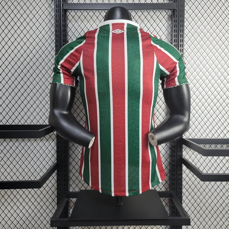 A Camisa 1 do Fluminense para a temporada 2024/25, desenvolvida pela Umbro, mantém as tradicionais cores verde, branco e grená em listras verticais, simbolizando a identidade do clube. Esta edição celebra a participação do Fluminense no Mundial de Clubes de 2025, destacando-se pela gola e mangas reforçadas, além de uma etiqueta especial com a inscrição "Das Laranjeiras para o mundo", enaltecendo a trajetória do time.