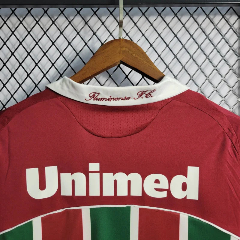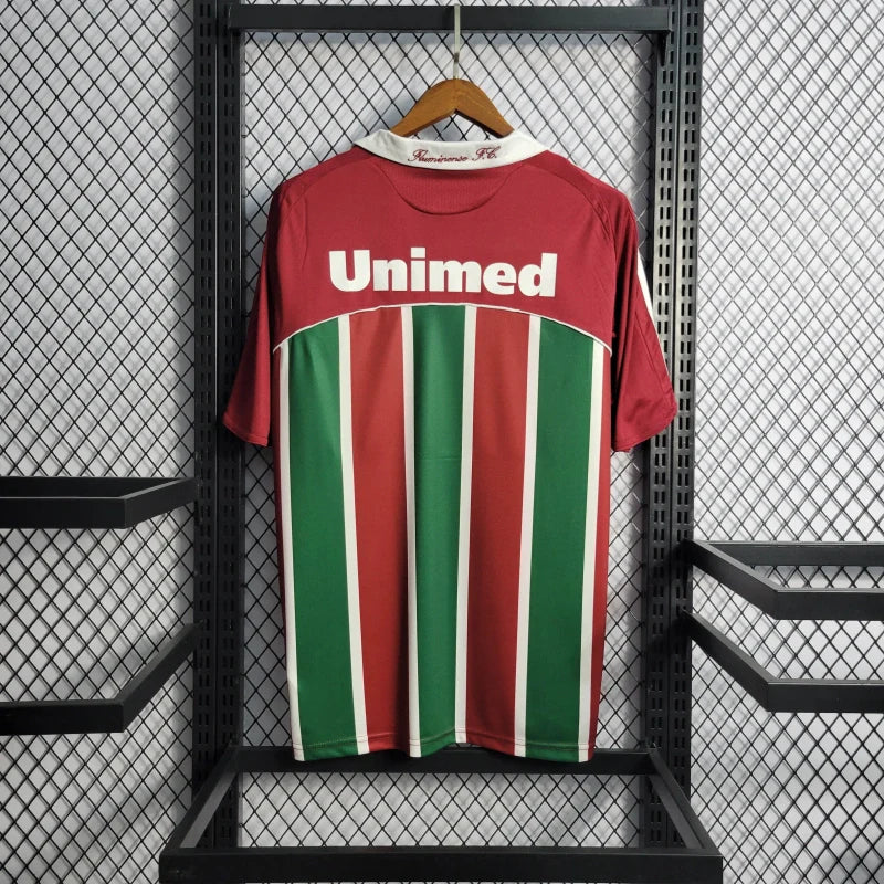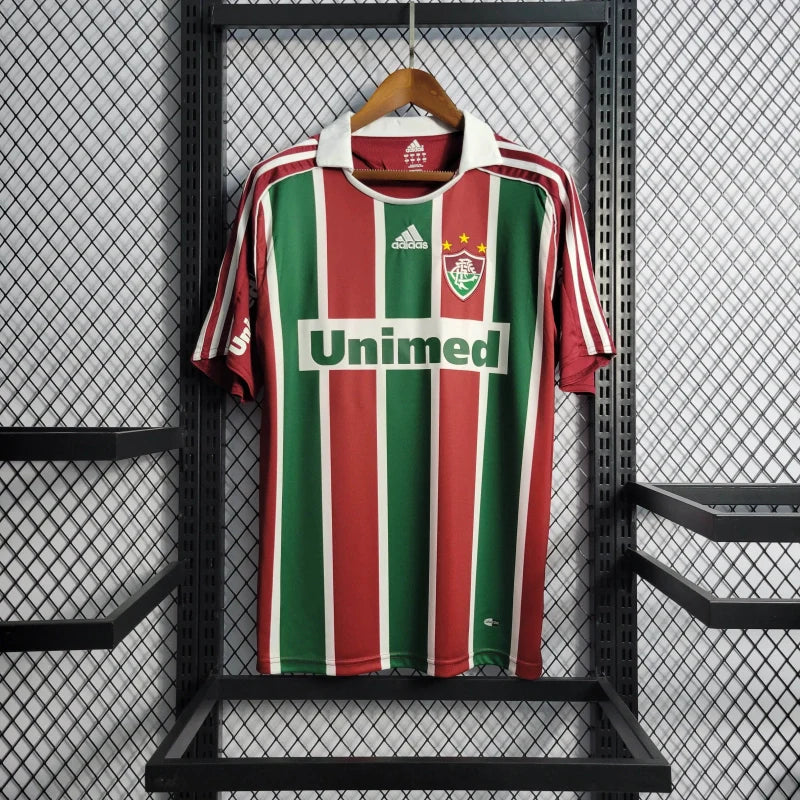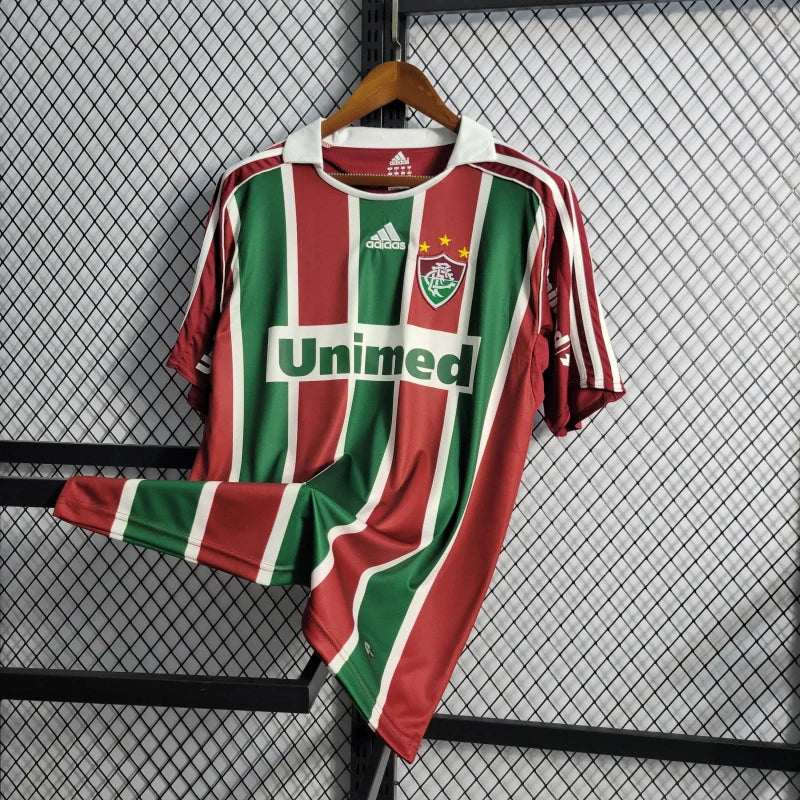 A Camisa 1 do Fluminense de 2008, produzida pela Adidas, é um item emblemático que remete à histórica campanha do clube na Copa Libertadores daquele ano, na qual o Fluminense alcançou a final. Este uniforme tricolor apresenta as tradicionais listras verticais em grená, verde e branco, com o escudo do clube bordado no peito e o logotipo da Adidas em destaque.