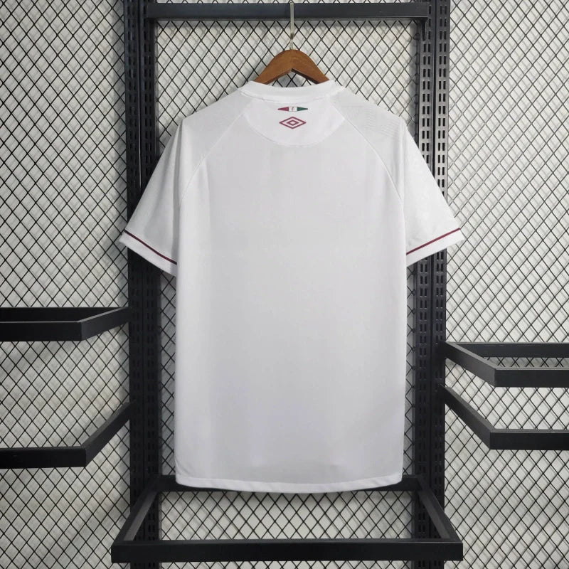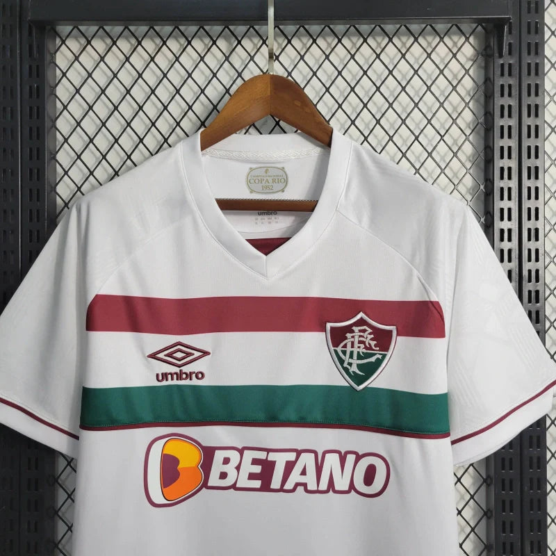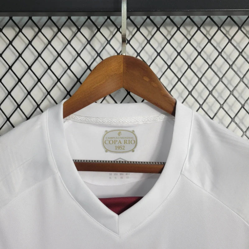 A Camisa 2 Fluminense 2024 Torcedor Masculina é uma peça que representa a paixão do torcedor tricolor, unindo tradição e modernidade. Seu design apresenta faixas diagonais em grená e verde sobre o fundo branco, destacando as cores icônicas do clube. A gola em V oferece um ajuste confortável e estiloso, ideal para uso dentro e fora dos estádios.