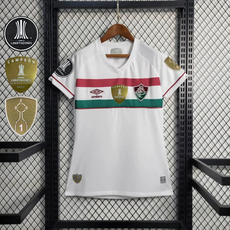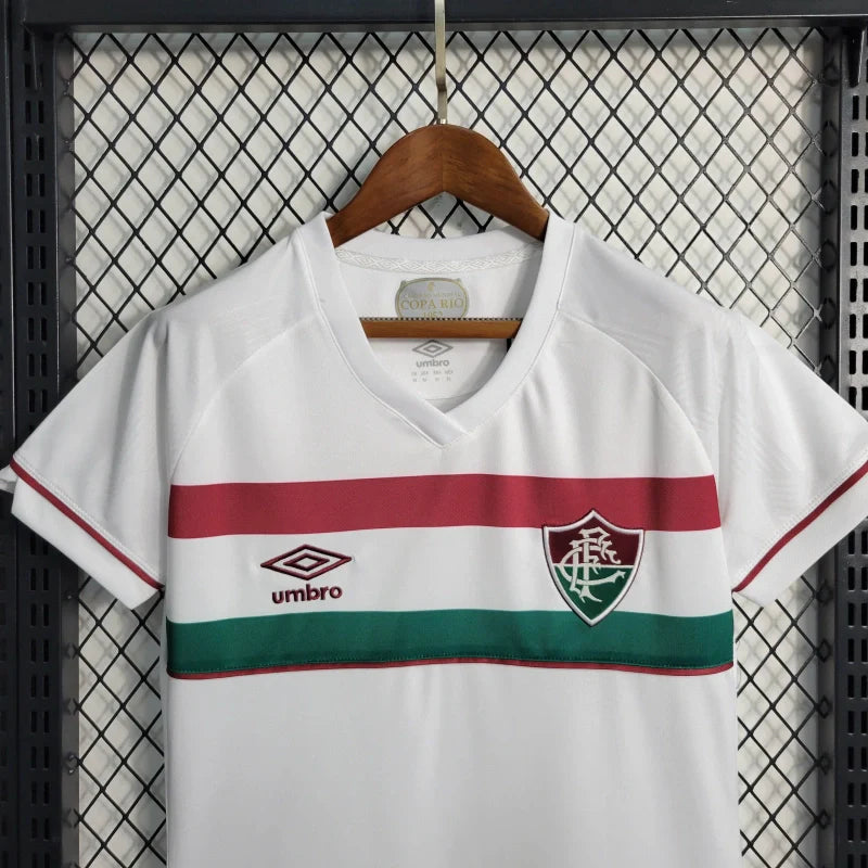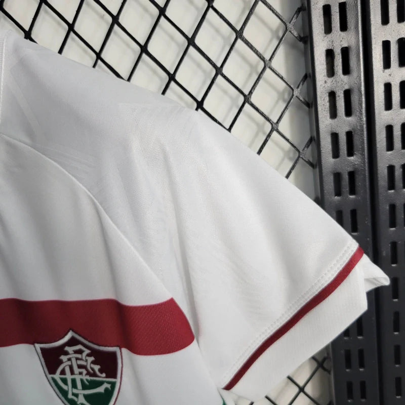 A Camisa 2 Fluminense 2023/24 Feminina é uma peça que combina tradição e modernidade, ideal para as torcedoras demonstrarem seu amor pelo Tricolor. Este modelo apresenta um design elegante com faixas diagonais em grená e verde sobre um fundo branco, destacando as cores emblemáticas do clube.