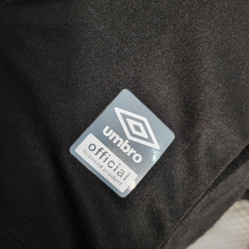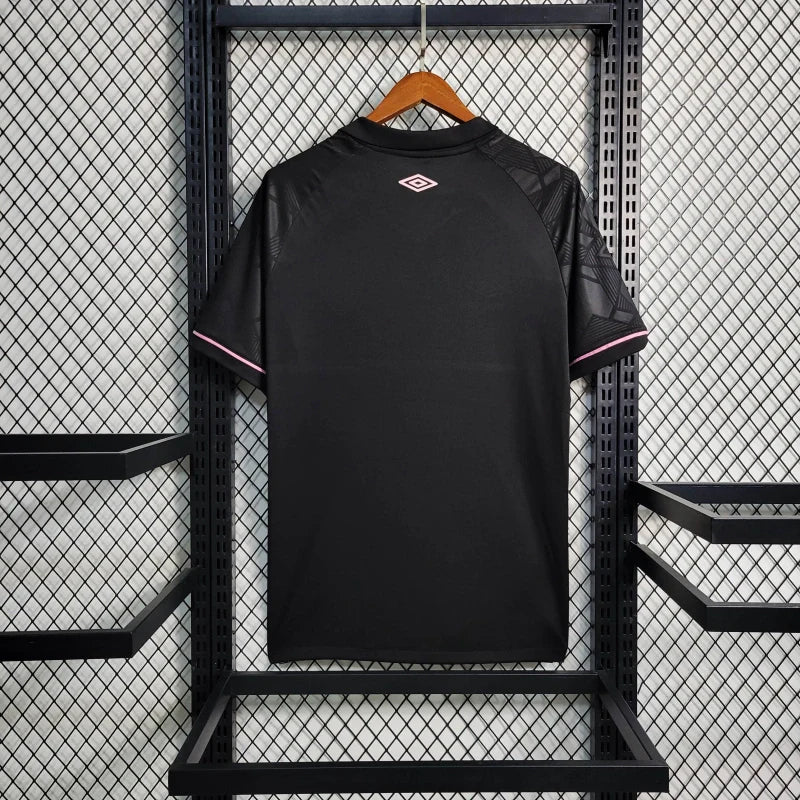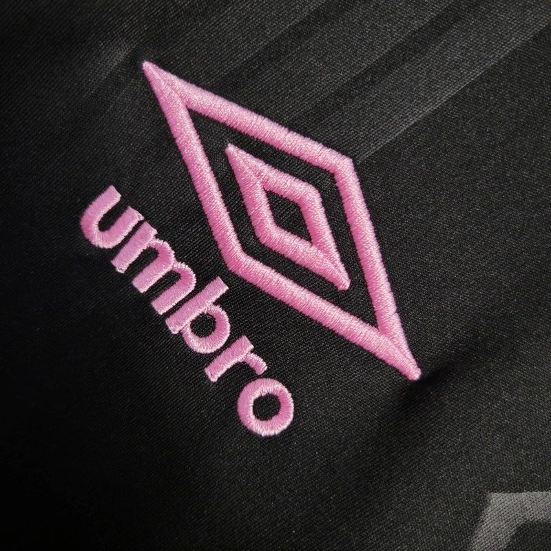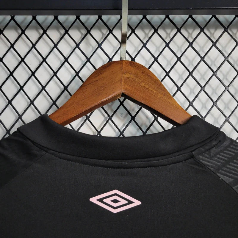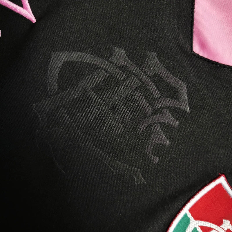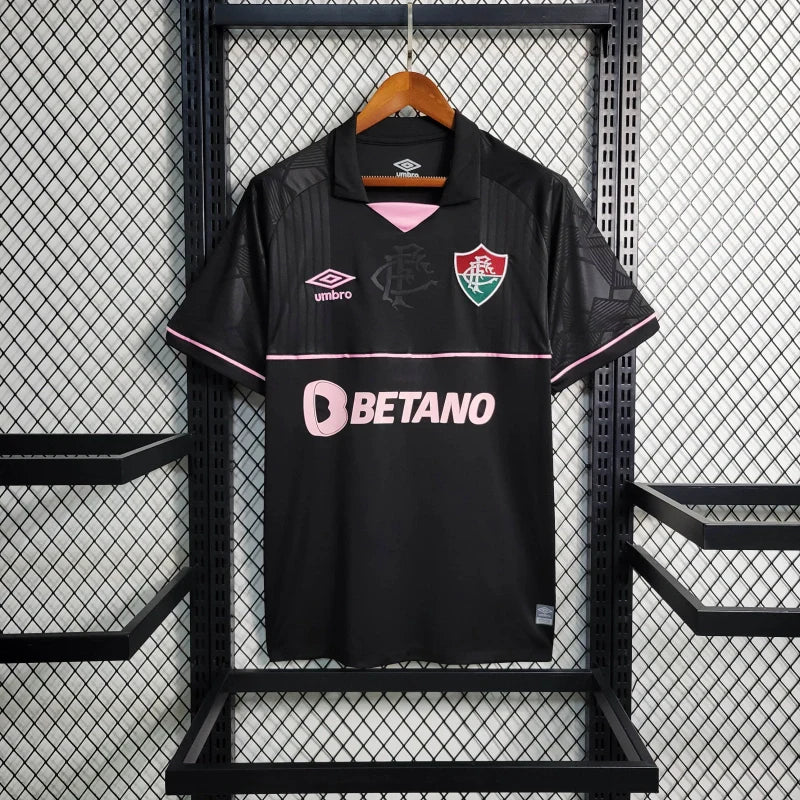 A Camisa de Goleiro do Fluminense 2023/24, nas cores preta e rosa, foi desenvolvida pela Umbro para a temporada mencionada. Este modelo apresenta um design clássico com gola polo e mangas curtas em estilo raglan. Detalhes como embossing do escudo em relevo e mangas em jacquard destacam-se na peça, que é confeccionada em 100% poliéster.