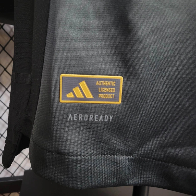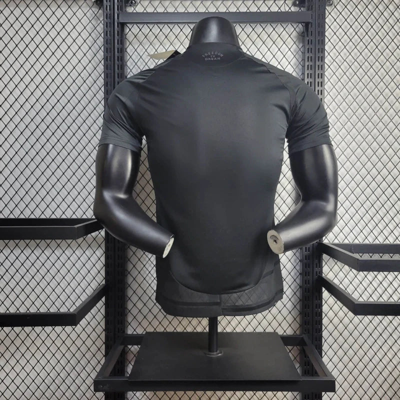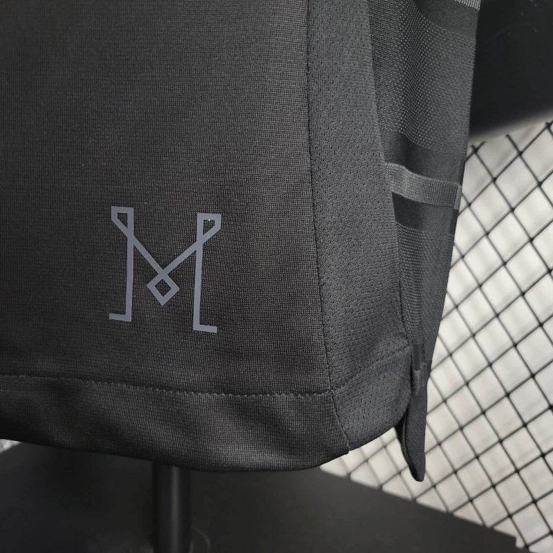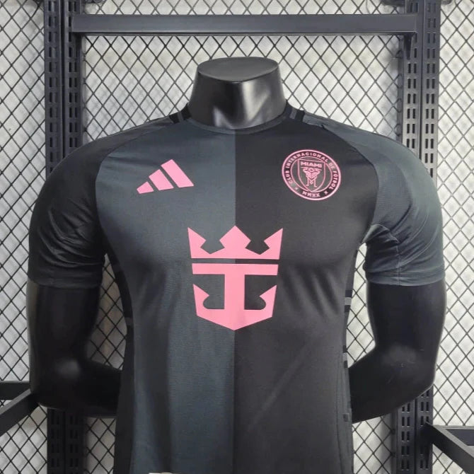 A nova camisa 2 do Inter Miami para a temporada 2025/26, conhecida como "Fortitude Kit", apresenta um design elegante em preto com detalhes em rosa, refletindo a força e resiliência do clube e sua comunidade. Esta versão jogador é confeccionada com materiais de alta qualidade, oferecendo conforto e desempenho superior.