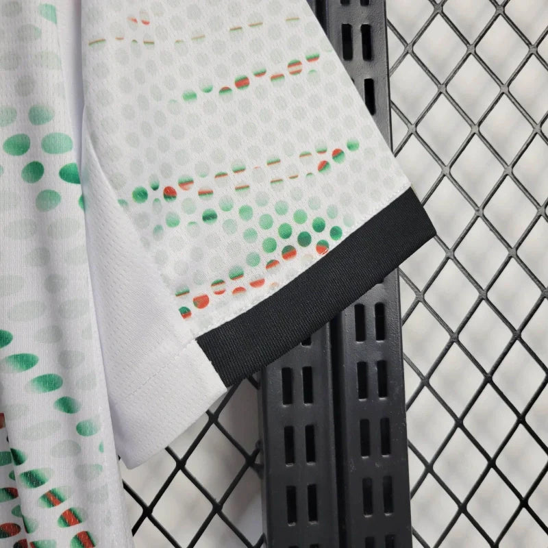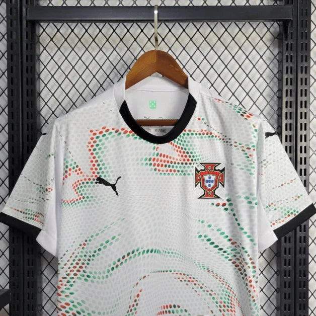A nova Camisa II da Seleção Portuguesa para a temporada 2025/26, produzida pela Puma, apresenta um design moderno e elegante. O uniforme reserva destaca-se pelo branco predominante, adornado com um padrão ondulado em tons de cinza, complementado por detalhes em verde e vermelho, simbolizando a rica herança cultural de Portugal. A gola redonda combina preto na parte frontal e branco na parte posterior, harmonizando com os punhos que seguem o mesmo esquema de cores. O escudo oficial da Federação Portuguesa está posicionado no lado esquerdo do peito, enquanto o logotipo da Puma aparece em preto no lado direito e nas mangas. Este uniforme foi concebido para oferecer conforto e desempenho, utilizando materiais de alta qualidade, tornando-o ideal para os torcedores demonstrarem seu apoio com estilo.