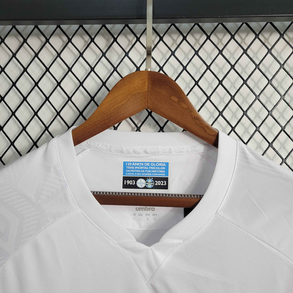 A camisa 2 do Grêmio para a temporada 2023/24 mantém a tradicional elegância do tricolor gaúcho, com um design predominantemente branco e detalhes em azul e preto. O modelo segue o padrão clássico do clube, trazendo um visual moderno com gola V e detalhes sutis que remetem à identidade gremista. Fabricada com tecnologia de ponta para garantir conforto e desempenho, a camisa é uma homenagem à história do clube e um item indispensável para os torcedores apaixonados.