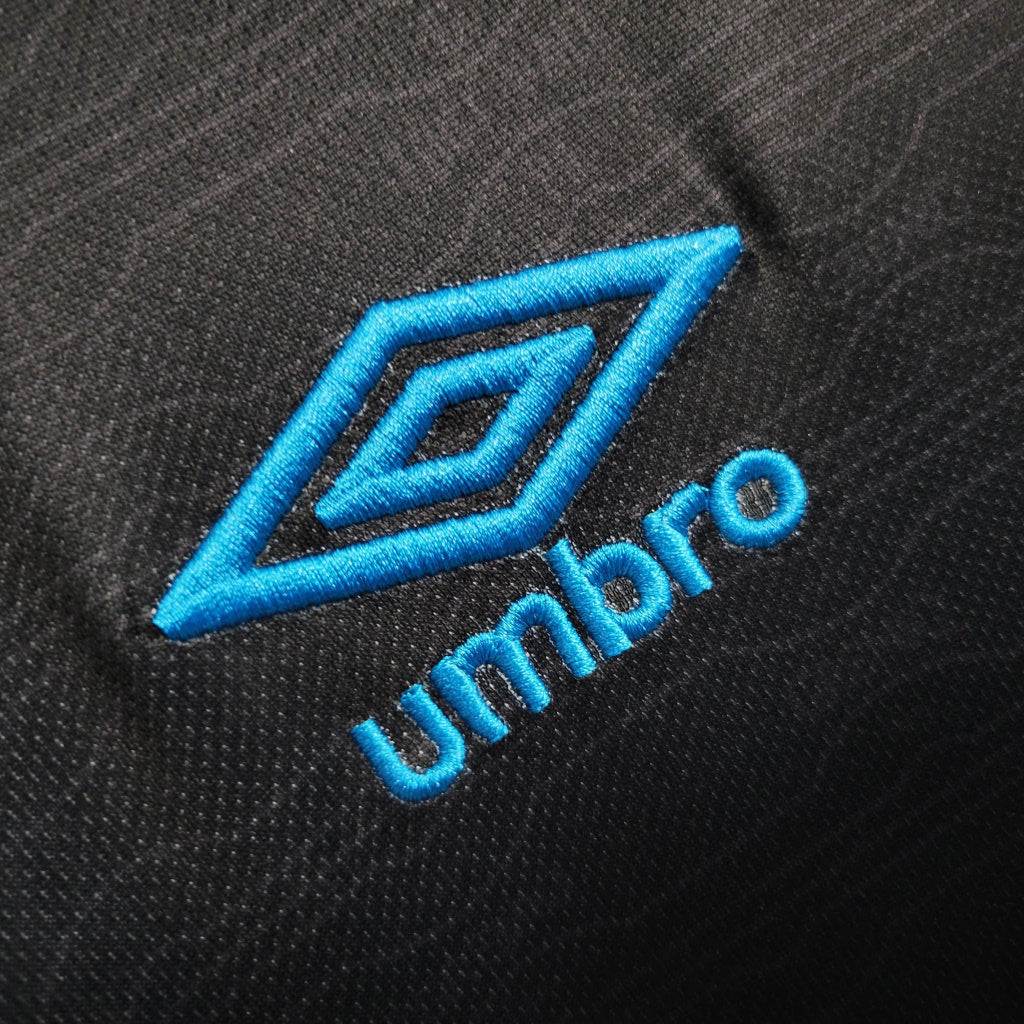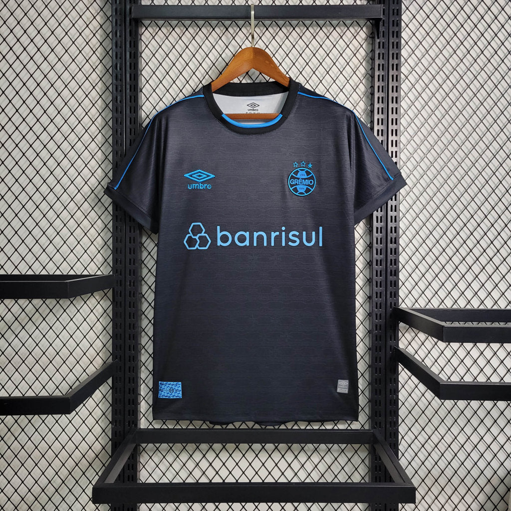A terceira camisa do Grêmio 2023/24 é uma peça que traz inovação e tradição em um design marcante. O uniforme tem um tom escuro predominante, com detalhes em azul celeste e dourado, proporcionando um visual sofisticado. O escudo do clube aparece em uma versão monocromática dourada, dando um toque especial à camisa.