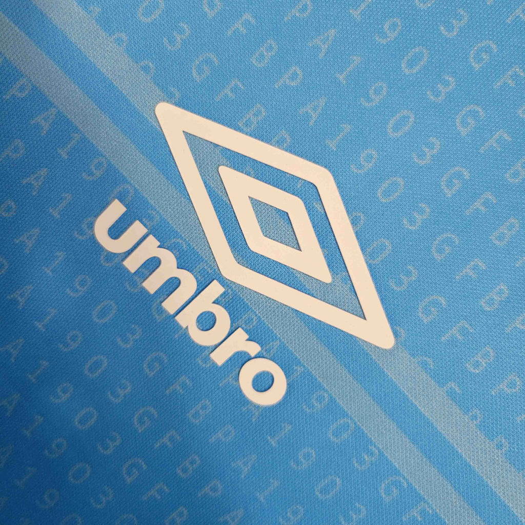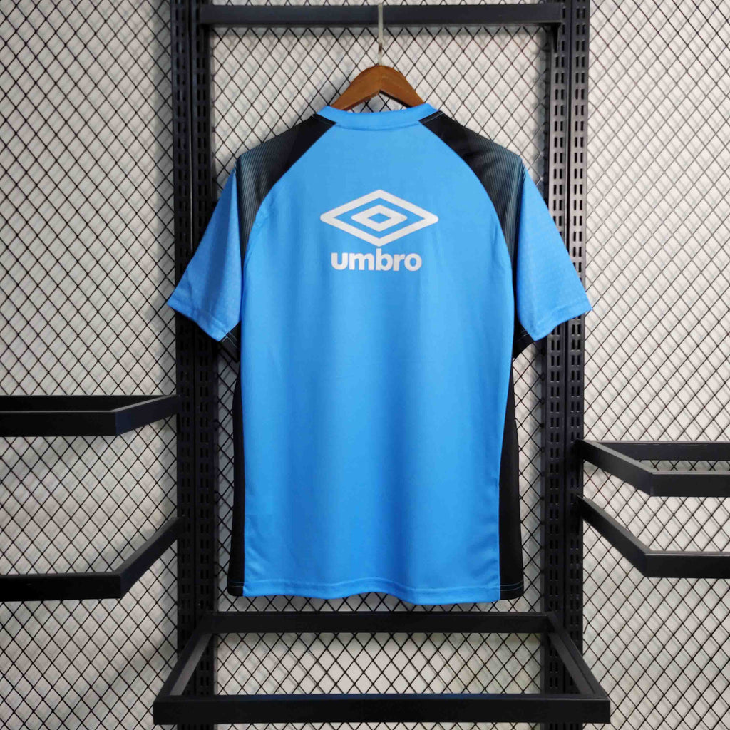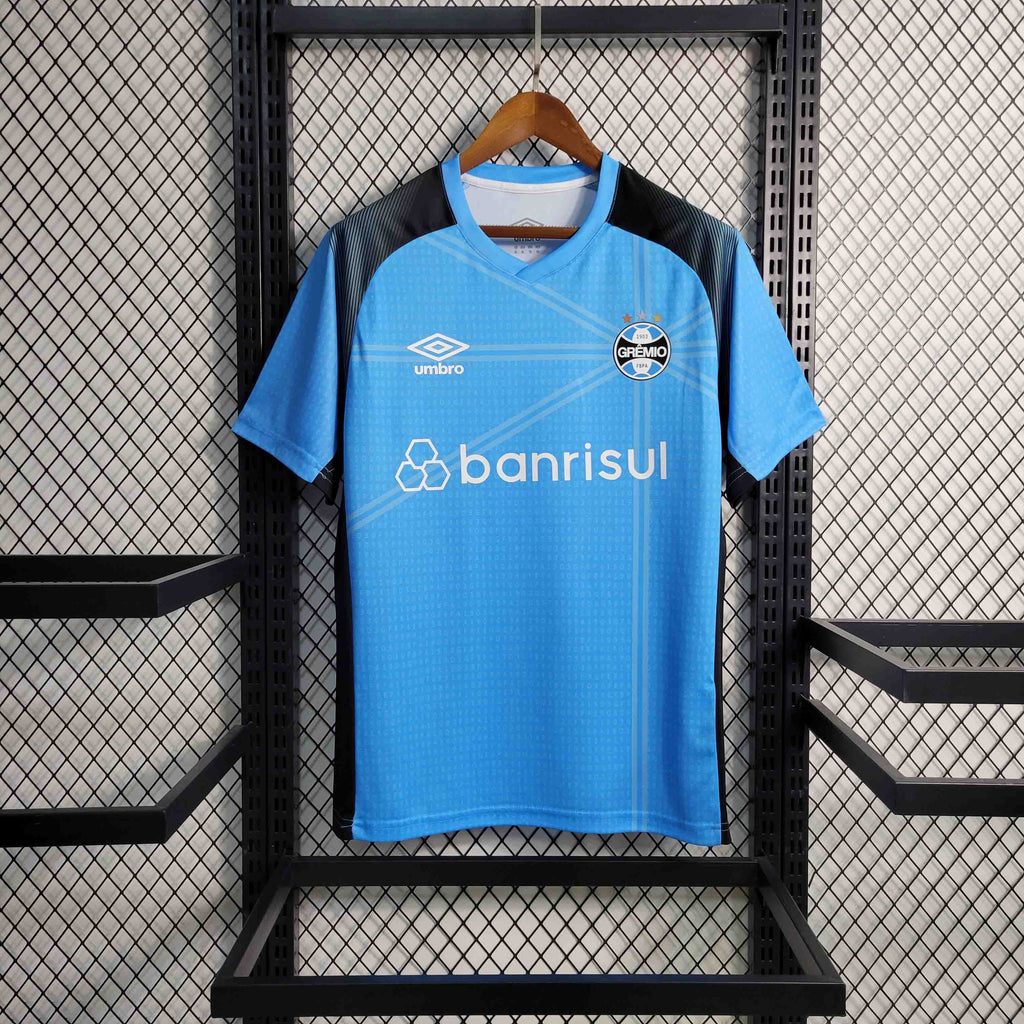 A Camisa de Aquecimento do Grêmio para a temporada 2023/24, desenvolvida pela Umbro, é confeccionada em uma combinação de 93% poliéster e 7% elastano, proporcionando conforto e flexibilidade aos torcedores. O design destaca-se pela cor azul predominante, complementada por detalhes em preto nas laterais e cavas, que são confeccionadas em tecido mesh para garantir maior respirabilidade.