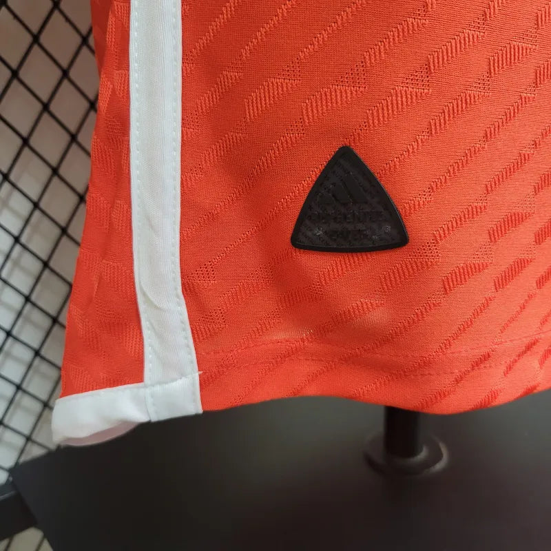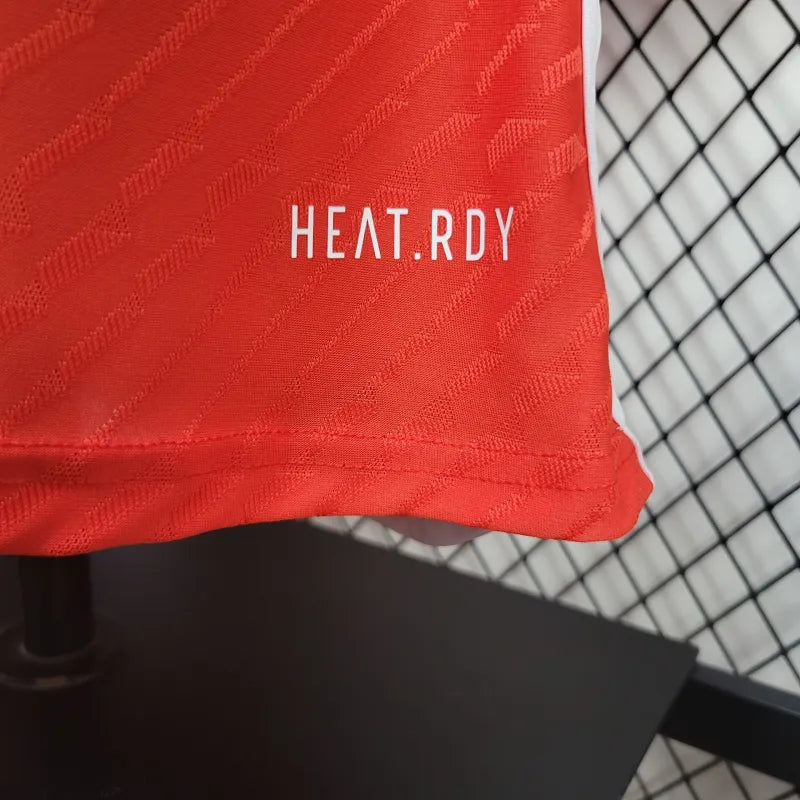 A Camisa 1 do Internacional para a temporada 2024/25, confeccionada pela Adidas, é a versão utilizada pelos jogadores em campo. Este modelo profissional oferece um ajuste mais justo ao corpo, garantindo liberdade de movimento e conforto durante as partidas. A peça é predominantemente vermelha, com detalhes em branco nas mangas, gola e faixas laterais que se conectam na barra traseira. O tecido tecnológico AEROREADY proporciona controle de umidade, mantendo os jogadores frescos e secos. O escudo do Internacional é aplicado no lado esquerdo do peito, enquanto o logo da Adidas aparece em branco no lado direito.