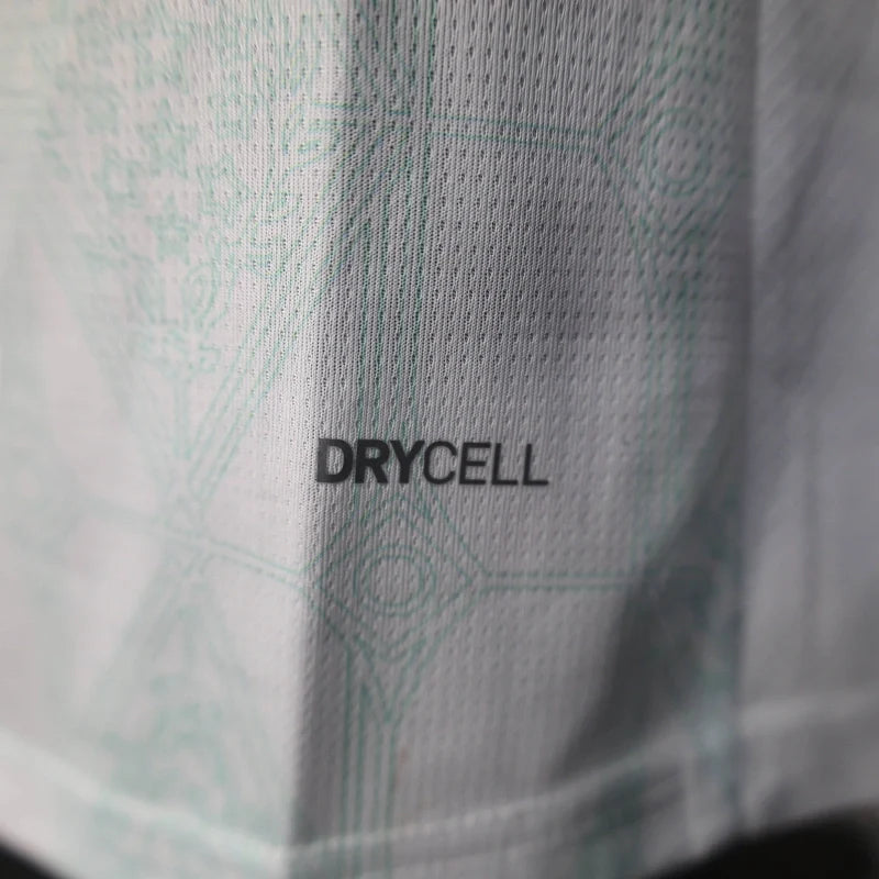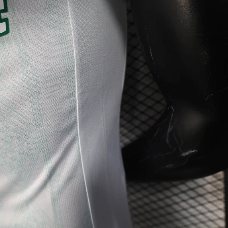 A Camisa II do Palmeiras para a temporada 2025/2026, versão Jogador, desenvolvida pela Puma que combina tradição e inovação. Predominantemente branca com mangas verdes, o uniforme apresenta uma gola polo branca que adiciona um toque clássico ao design. O escudo oficial do Palmeiras é emborrachado e texturizado no lado esquerdo do peito, enquanto o logo da Puma aparece destacado no lado direito. O design incorpora grafismos que remetem às taças conquistadas pelo clube, simbolizando as glórias e a história vitoriosa do Verdão.
