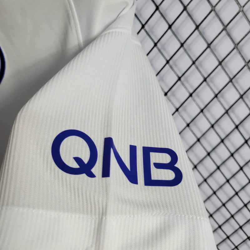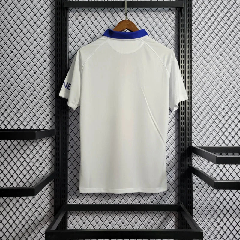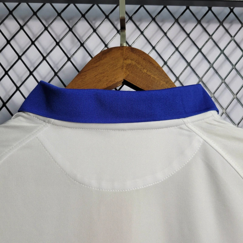 A Camisa 2 Retrô do Paris Saint-Germain 2020/21 é uma peça que celebra a elegância e a tradição do clube francês. Inspirada no uniforme reserva da temporada 2020/21, esta camisa apresenta um design predominantemente branco, com uma faixa central azul e detalhes em vermelho, remetendo às cores clássicas do PSG. A gola polo azul com botões vermelhos adiciona um toque de sofisticação ao modelo.