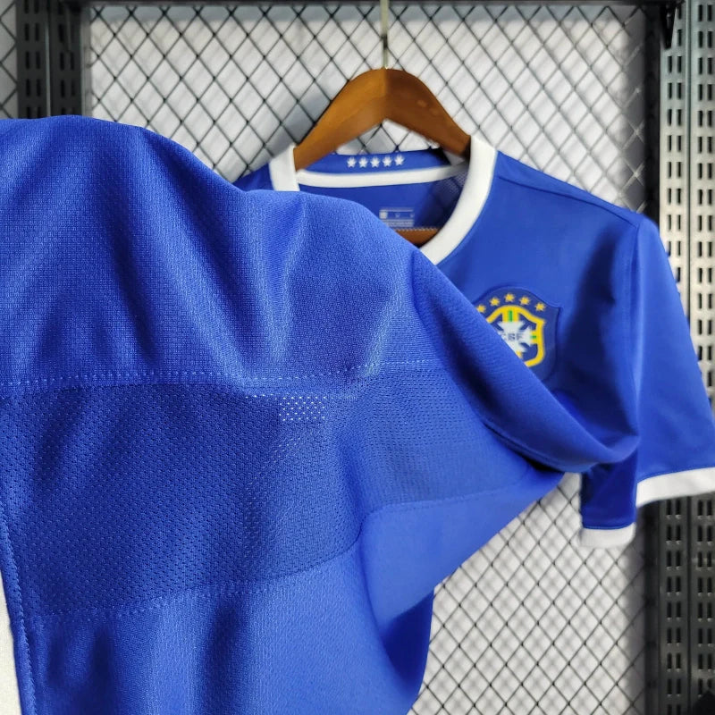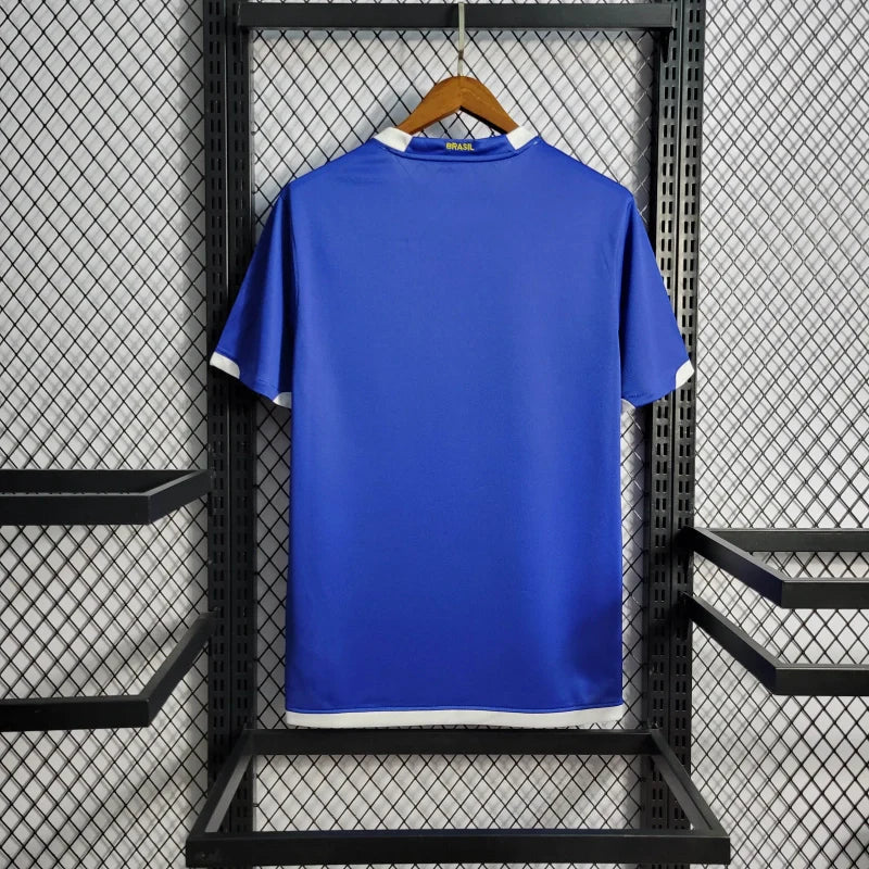 A Camisa Retrô 2006 da Seleção Brasileira II, na cor azul, é uma peça icônica que homenageia a participação do Brasil na Copa do Mundo de 2006, realizada na Alemanha. Produzida pela Nike, esta camisa combina tradição e modernidade, refletindo o estilo de jogo que encantou o mundo naquela época.