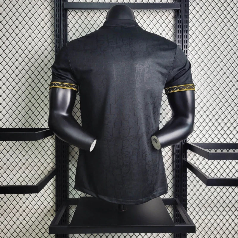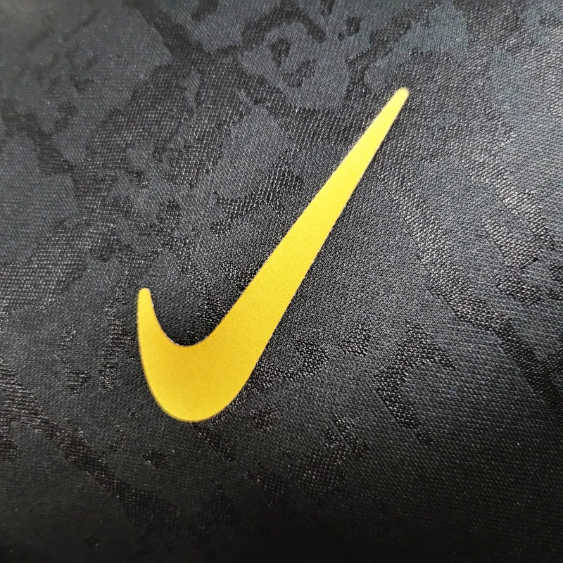 Inspirada na grandeza do futebol brasileiro, a camisa “Golden Legacy” 2023 une sofisticação e história em um design exclusivo. Com um tom preto elegante e detalhes dourados imponentes, essa edição especial simboliza a tradição vitoriosa da Seleção Brasileira. O escudo e o swoosh da Nike aparecem em dourado reluzente, representando a conquista e o brilho dos craques que fizeram história. A textura discreta no tecido traz elementos inspirados na cultura nacional, enquanto as mangas apresentam grafismos tribais, reforçando a identidade única do Brasil. Feita com tecnologia Nike Dri-FIT ADV, a camisa oferece máximo conforto, respirabilidade e desempenho para quem busca vestir o manto com orgulho. Mais do que um uniforme, é um símbolo de respeito à trajetória gloriosa da Seleção.