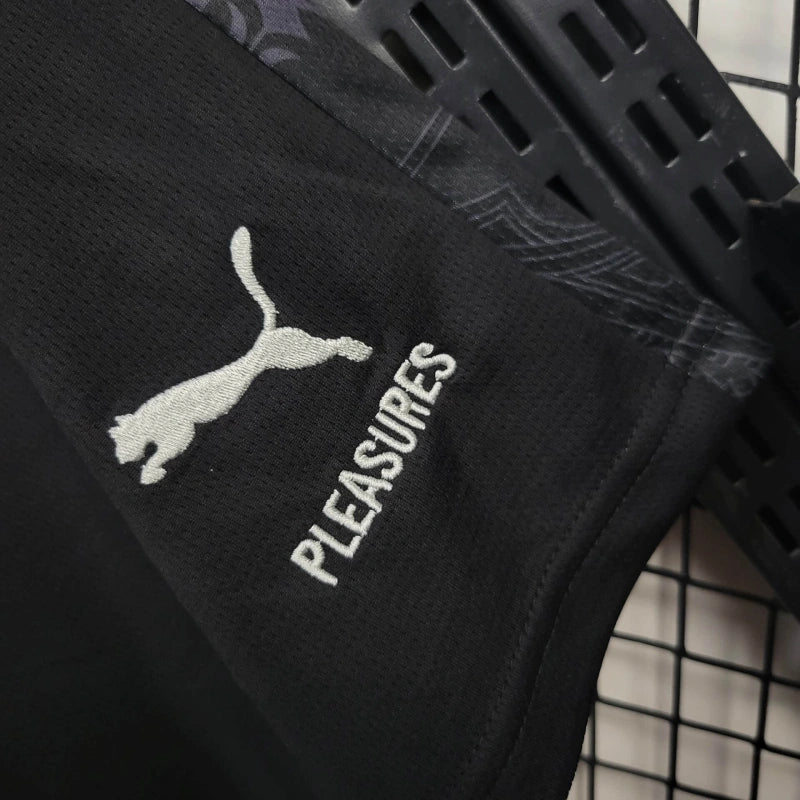 A Bermuda AC Milan x Pleasures Black 2024/25 é uma peça exclusiva que une a tradição do futebol italiano com a estética urbana da marca de streetwear PLEASURES, em colaboração com a PUMA. Parte do quarto uniforme do AC Milan para a temporada 2023/24, essa bermuda destaca-se pelo design arrojado e detalhes inspirados na arquitetura gótica de Milão.