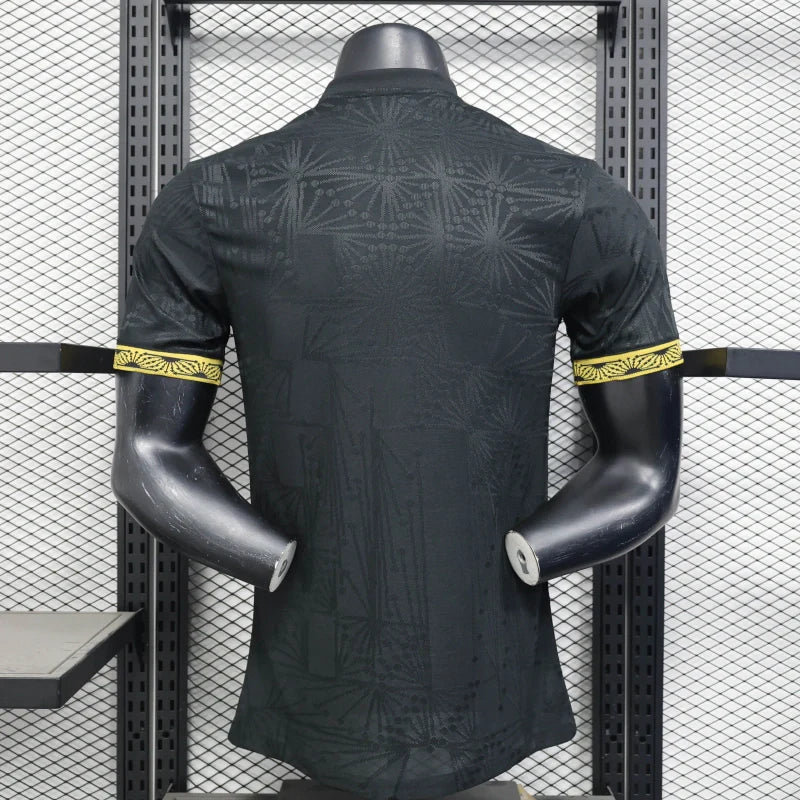 A camisa do México para a Copa Ouro 2025 é preta e traz ao longo do corpo, grafismos em tom sobre tom, que representam a rica história da cultura e do cinema do México (entre as décadas de 30 e 50 do século passado), bem como a música, que através dos mariachis, ganhou o mundo. Esses detalhes são vistos com mais ênfase nos punhos que ganham a cor dourada.