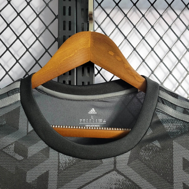 O escudo monocromático do Arsenal ao peito reforça a elegância da peça, enquanto o patrocínio "Emirates Fly Better" e o logo Adidas complementam o visual premium. Inspirada nos padrões urbanos e nas raízes do norte de Londres, a camisola traz uma estampa subtil que representa a conexão entre clube, cidade e comunidade.