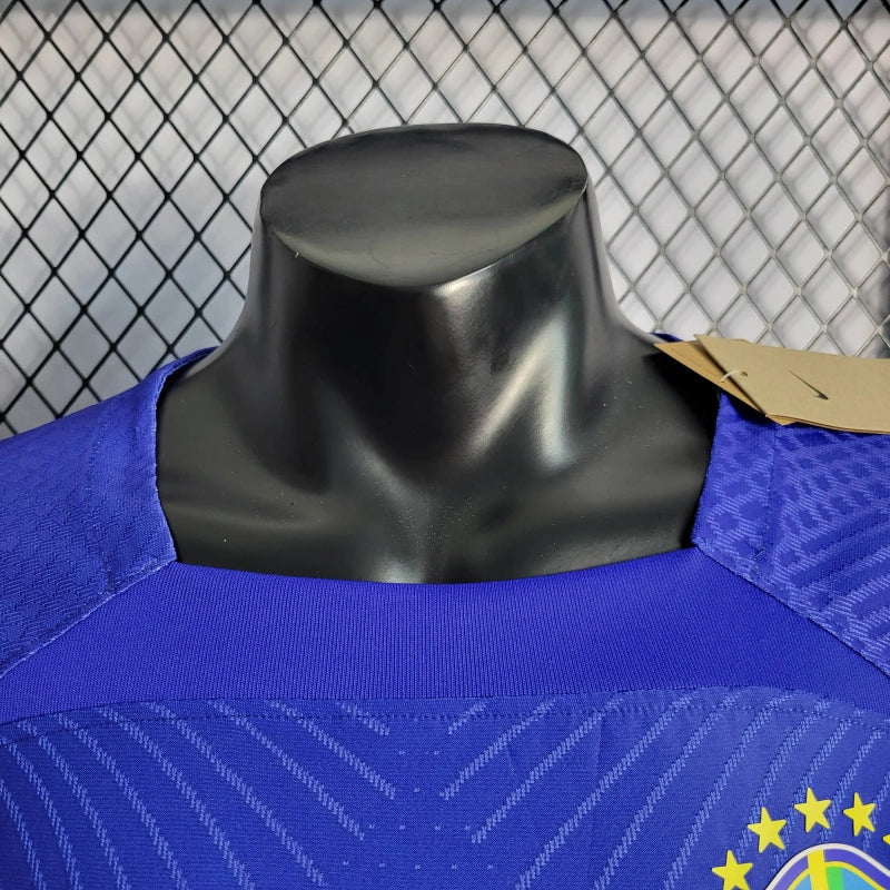 A Camisa 2 Brasil 2022/23 Jogador, desenvolvida pela Nike, é uma peça que combina inovação e tradição. Predominantemente azul, o modelo traz uma estampa sutil inspirada na onça-pintada, um dos símbolos da garra brasileira. O design moderno conta com gola em V e detalhes em verde nas mangas, criando um contraste vibrante e autêntico. Feita com a tecnologia Nike Dri-FIT ADV, a camisa proporciona respirabilidade e mantém o corpo seco, garantindo máximo conforto e desempenho.