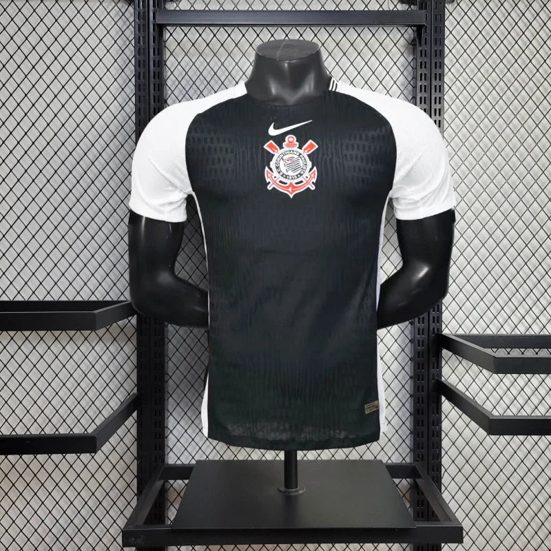 A Camisa 2 do Corinthians 2025/26 – Versão Jogador, desenvolvida pela Nike, é uma homenagem à conquista do Mundial de Clubes de 2000, refletindo a tradição e a história do clube. Com design predominantemente preto, possui detalhes em branco na gola, ombros e mangas, além das laterais, criando um contraste marcante. O escudo do Corinthians está centralizado no peito, com o logotipo da Nike posicionado logo abaixo, ambos em branco, replicando o layout do uniforme utilizado na final do Mundial de 2000.