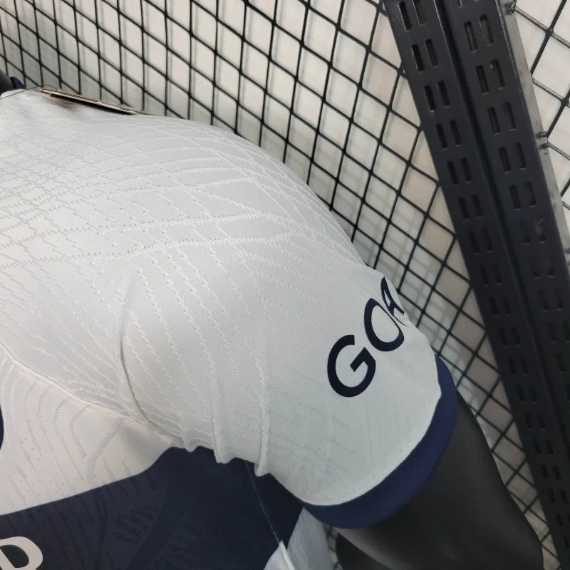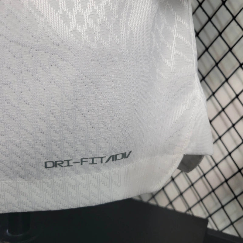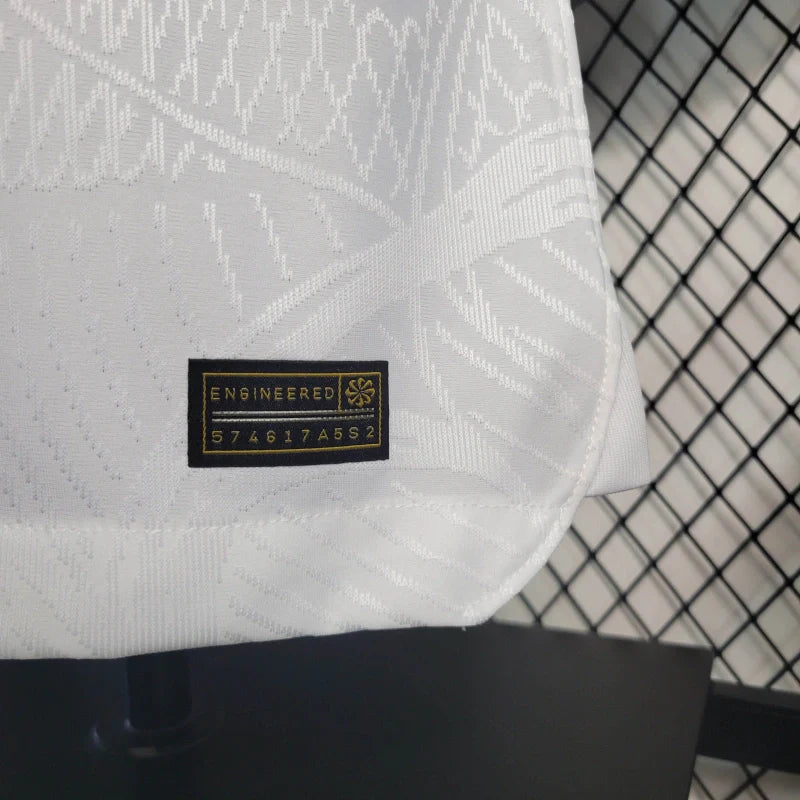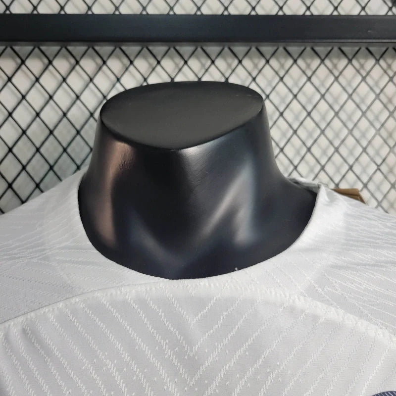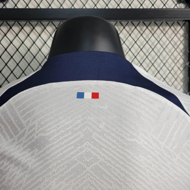 A Camisa 2 Paris Saint-Germain 2023/24 Jogador é uma peça autêntica que celebra a elegância e a tradição do clube francês. Inspirada na temporada em que o PSG conquistou a Ligue 1 e alcançou a semifinal da UEFA Champions League, esta camisa apresenta um design predominantemente branco, com uma faixa central que transita do vermelho ao azul, simbolizando as luzes icônicas de Paris se dissipando na noite.