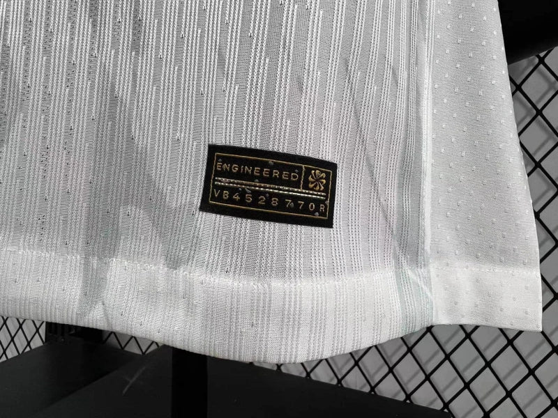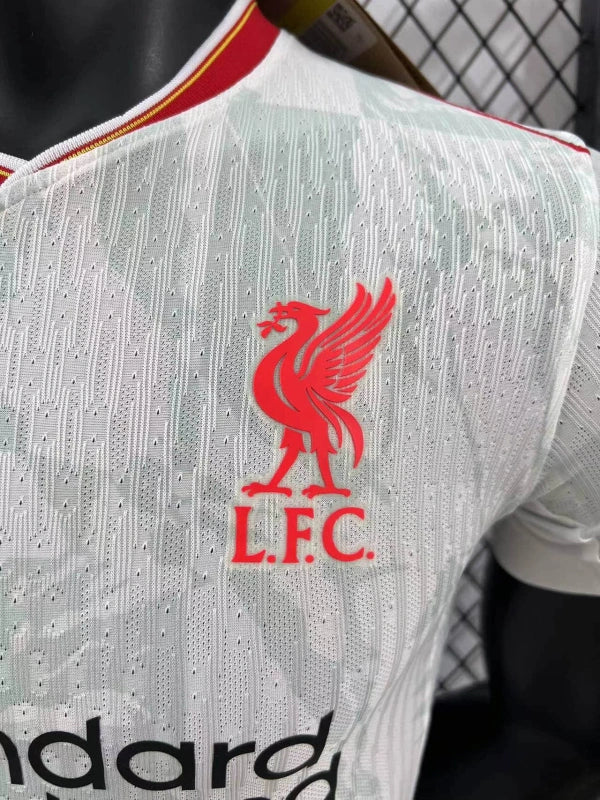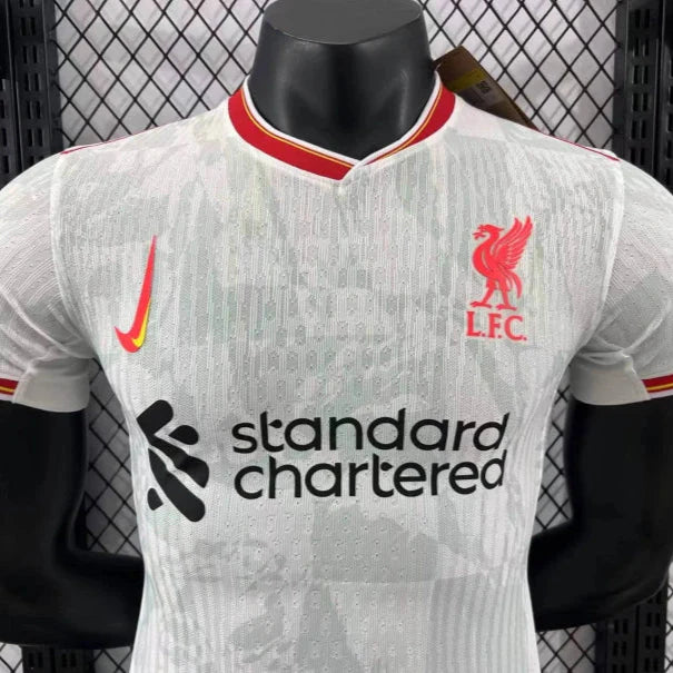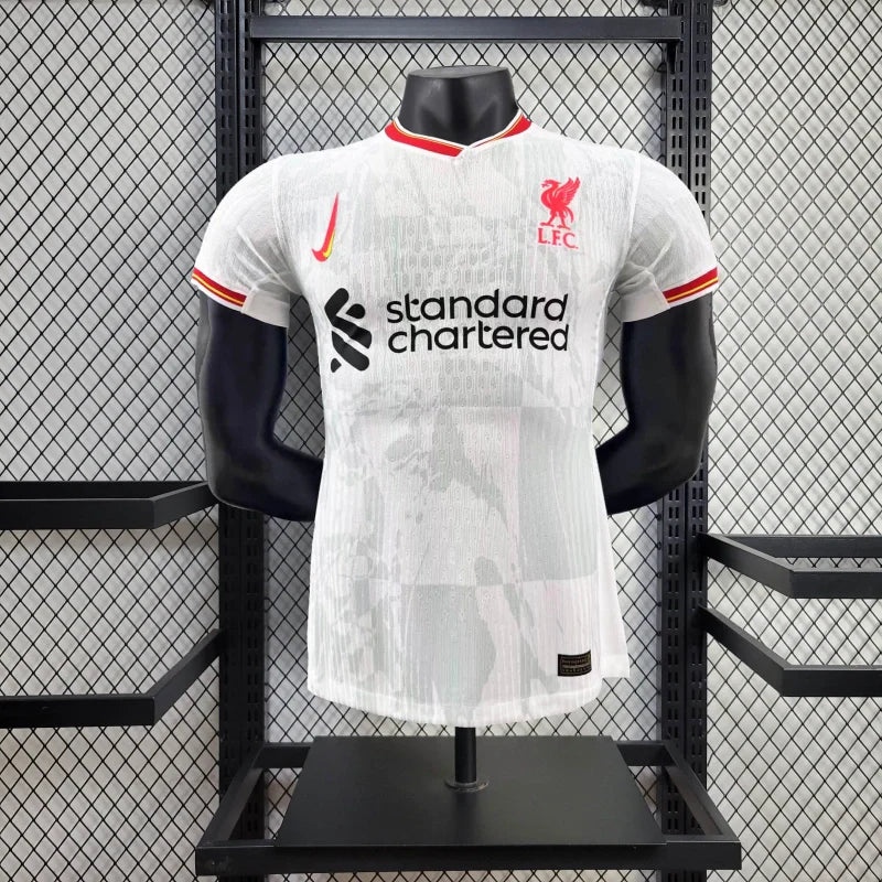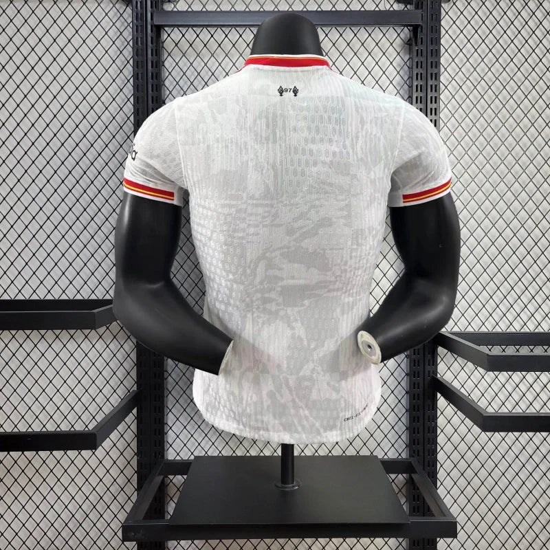 A Camisa 3 do Liverpool 2024/25 – Versão Jogador celebra a identidade dos Reds com um visual moderno e arrojado. Predominantemente branca, ela conta com detalhes em vermelho e amarelo nas mangas e na gola, remetendo às cores tradicionais do clube. O escudo do Liverpool e o logo da Nike aparecem em vermelho, enquanto um padrão gráfico sutil no tecido adiciona sofisticação ao design. Produzida com tecido 100% poliéster e tecnologia Nike Dri-FIT, oferece respirabilidade e conforto durante o uso, além de contar com modelagem slim fit para um caimento atlético. É a escolha perfeita para torcedores apaixonados que buscam unir estilo, desempenho e orgulho pelo clube.