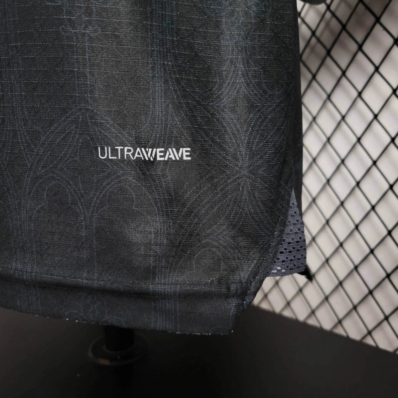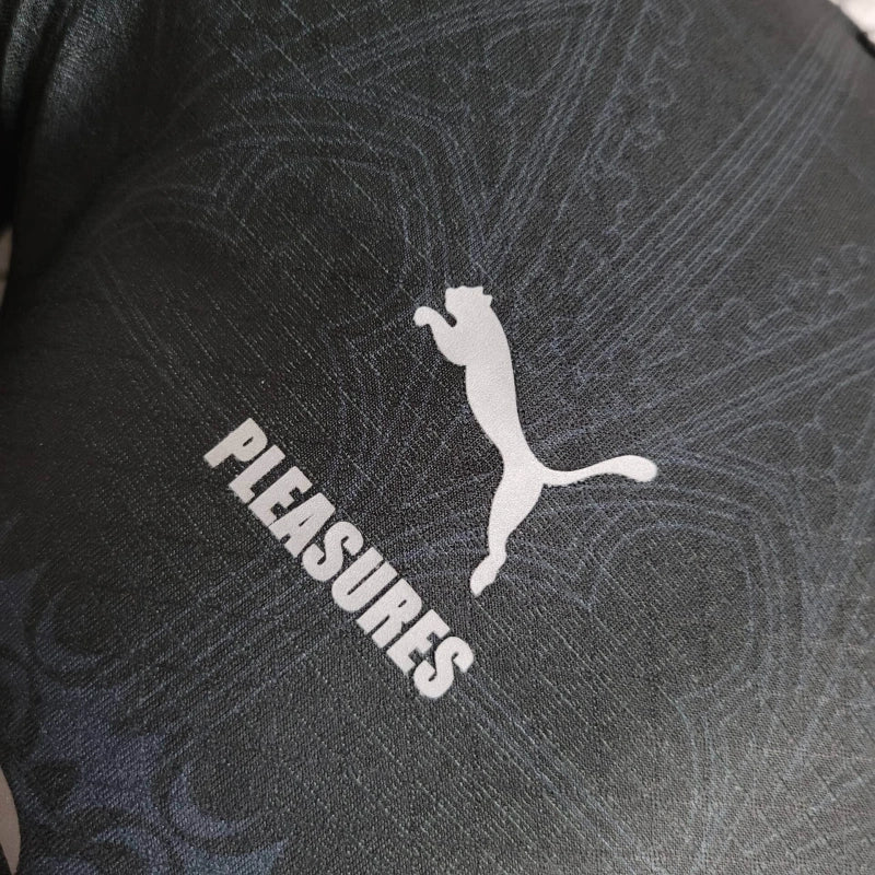 A Camisa 4 do AC Milan x PLEASURES 2023/24 – Versão Jogador é uma peça que une tradição e inovação, resultado da colaboração entre o AC Milan, a PUMA e a marca de streetwear de Los Angeles, PLEASURES. Este uniforme celebra a fusão do estilo urbano californiano com a arquitetura gótica milanesa, refletindo a identidade única do clube e da cidade.