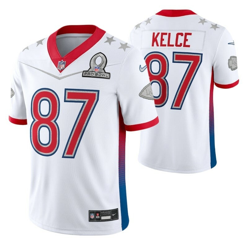 Reviva o brilho do jogo das estrelas da NFL com a jersey oficial de Travis Kelce e Marrones no Pro Bowl 2022. Modelo branco com detalhes em vermelho e azul, escudo AFC e patch exclusivo do evento. Perfeita para colecionadores e fãs apaixonados pelos Chiefs e pelo camisa 87.